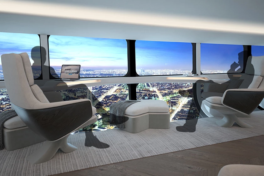 Airlander will typically operate from purpose-built terminals away from crowded airports. On board, the aircraft is extremely quiet as the engines are far away from the passenger cabin. There is ample space to socialise, to work, to eat and drink, and to relax quietly. Low vibration makes it a calm, more comfortable journey. The floor to ceiling windows mean natural light streams in and fresh air can circulate as the windows can open. Throughout the flight, Airlander produces dramatically fewer emissions than other aircraft.